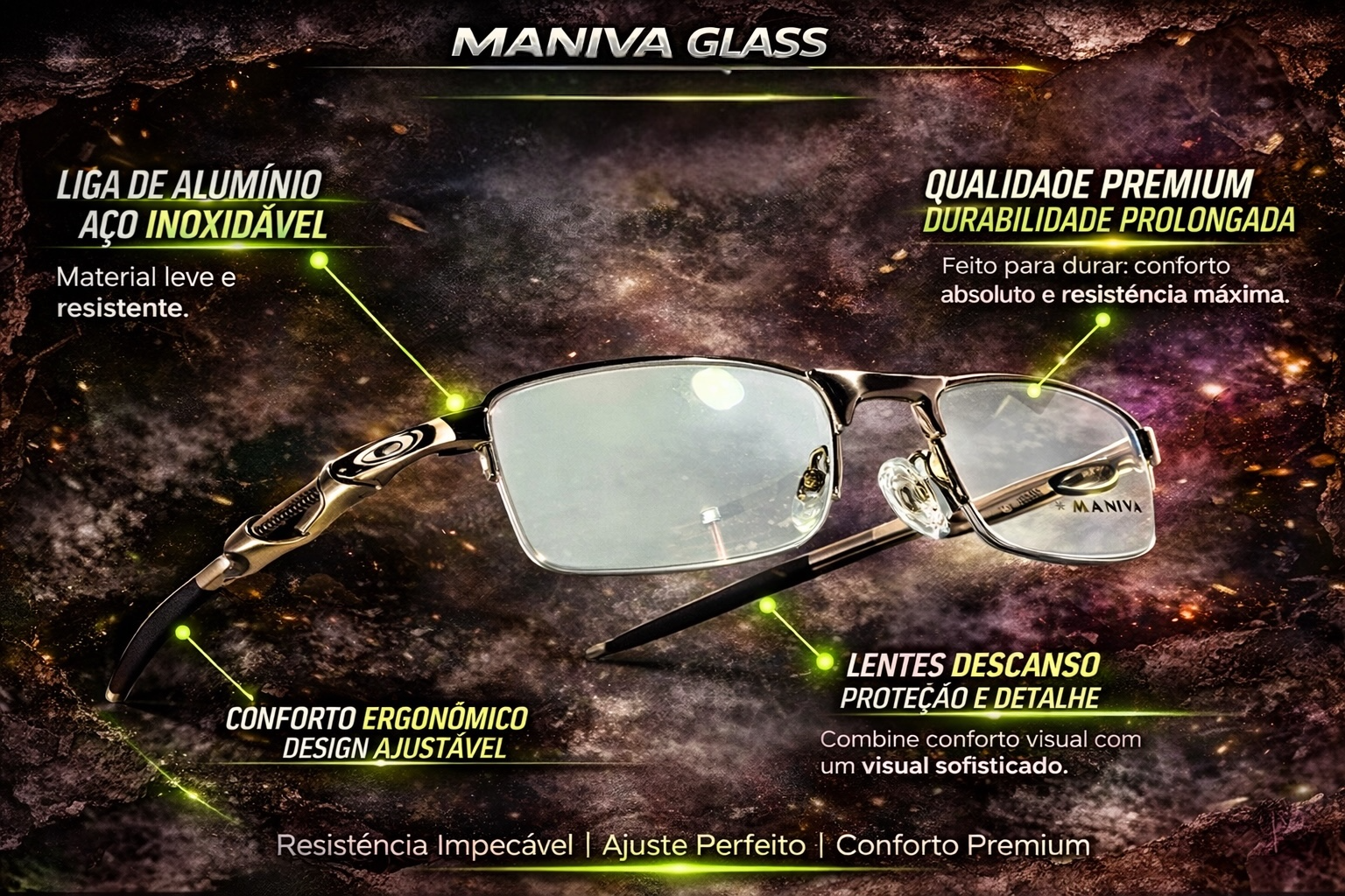 Armação em metal leve e resistente, ideal para quem busca conforto, durabilidade e visual sofisticado no dia a dia.